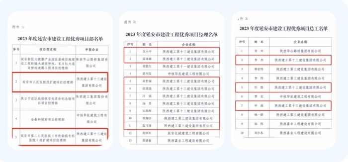 集團(tuán)延安市人民醫(yī)院改擴(kuò)建項(xiàng)目經(jīng)理部、延安市第二人民醫(yī)院(市傳染病??漆t(yī)院)改擴(kuò)建項(xiàng)目經(jīng)理部、陜甘寧邊區(qū)政府保安處革命紀(jì)念館項(xiàng)目經(jīng)理部被評(píng)為“2023年度延安市建設(shè)工程優(yōu)秀項(xiàng)目部”;吳小平、雷亞雄、高哲源、張溪強(qiáng)、汪強(qiáng)、湯勇、宋院輝等人被評(píng)為“2023年度延安市建設(shè)工程優(yōu)秀項(xiàng)目經(jīng)理”;李杰、忻煜、申虎等人被評(píng)為“2023年度延安市建設(shè)工程優(yōu)秀項(xiàng)目總工”。